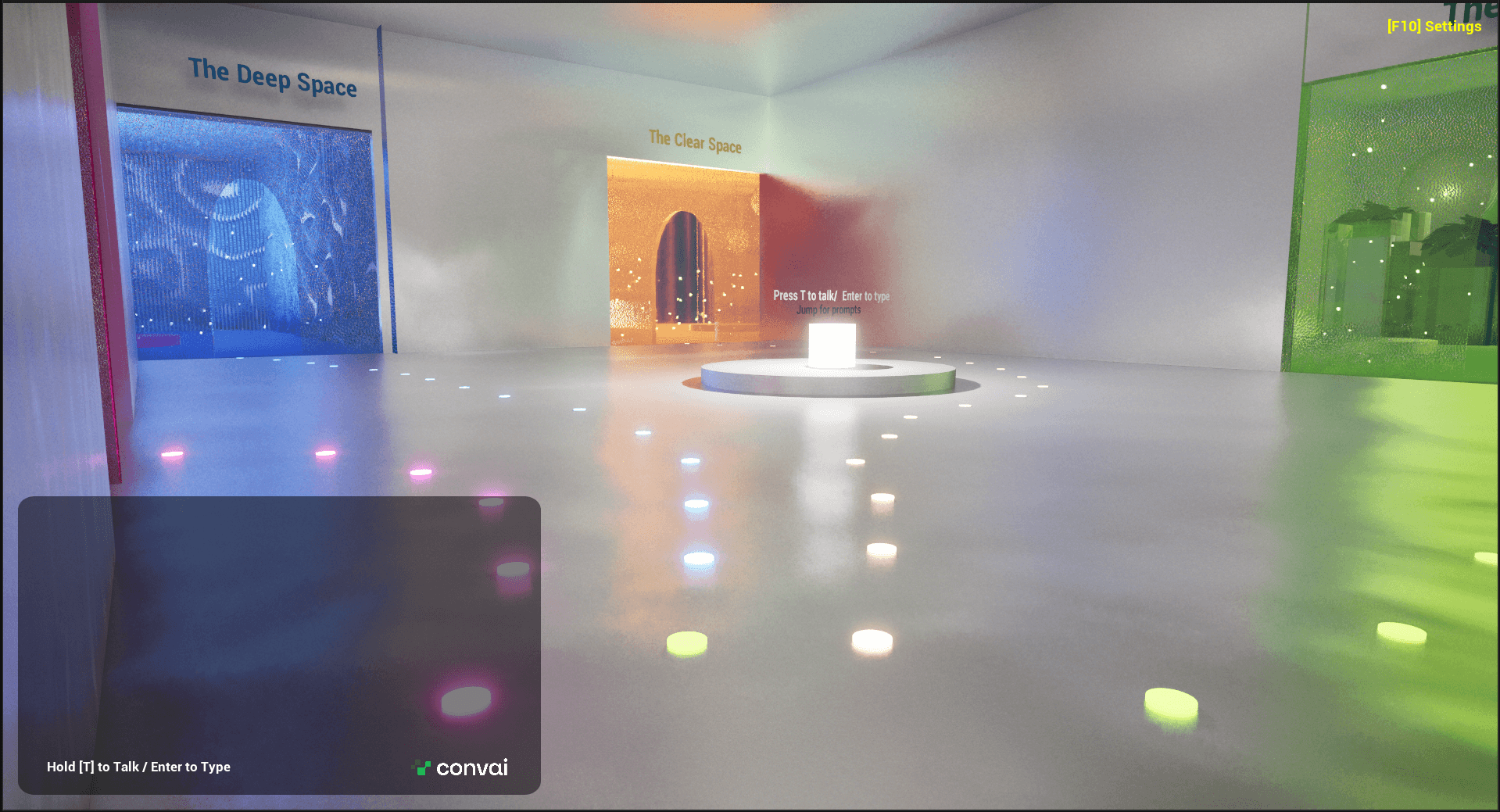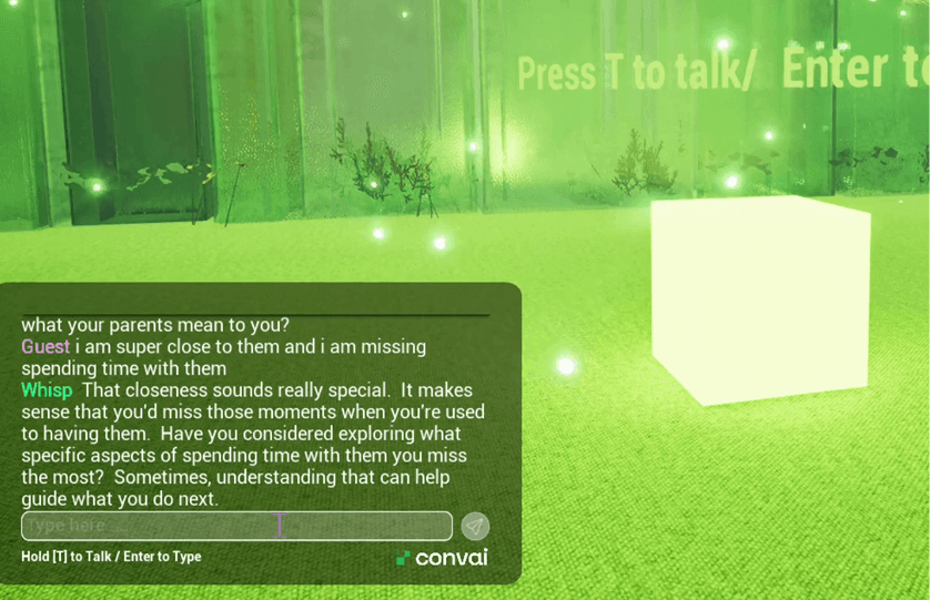 These experiments led to an early prototype: a glowing forest with a floating AI orb.